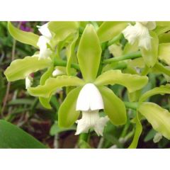 Orquídea que apresenta pétalas e sepálas verdes e labelo branco.