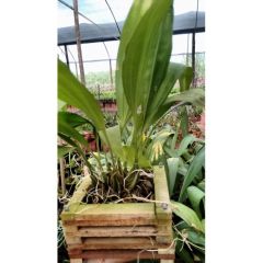 A muda é enviada com o vaso (cachepo de madeira conforme a foto), com as raízes no substrato.