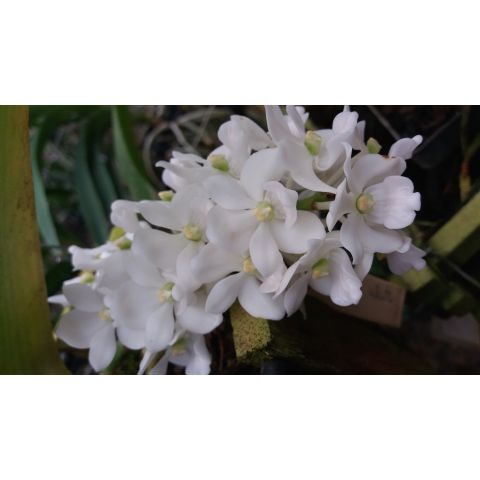 Orquídea com flores brancas com pintalgado leve cor de pessêgo.